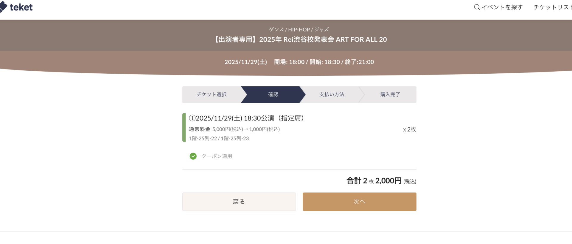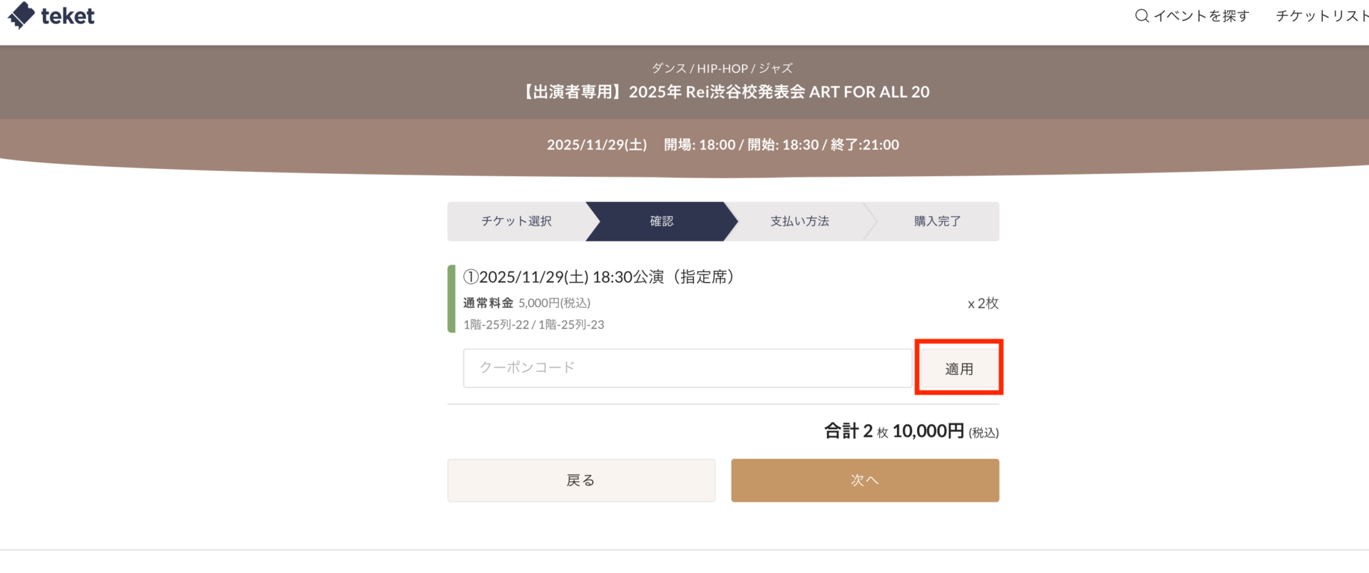 出演者で”指定席チケット(¥5,000)”で購入する方は専用のクーポンコード「afa20ticket」をご入力をし、適用ボタンを押してください。