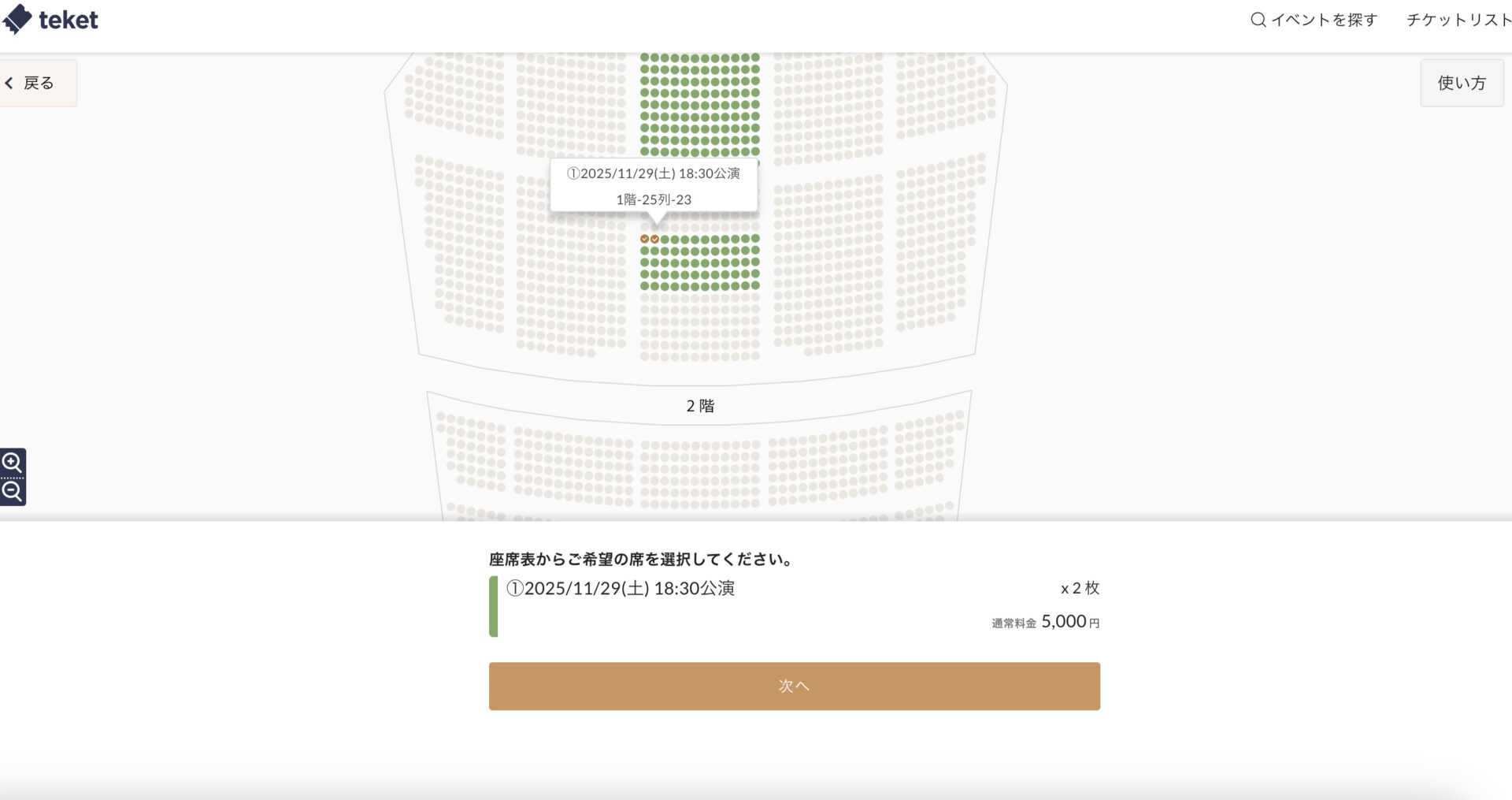 ③座席を選択(購入ページで選択可能)→次へ進む (※1公演ごとのチケット選択となります。)