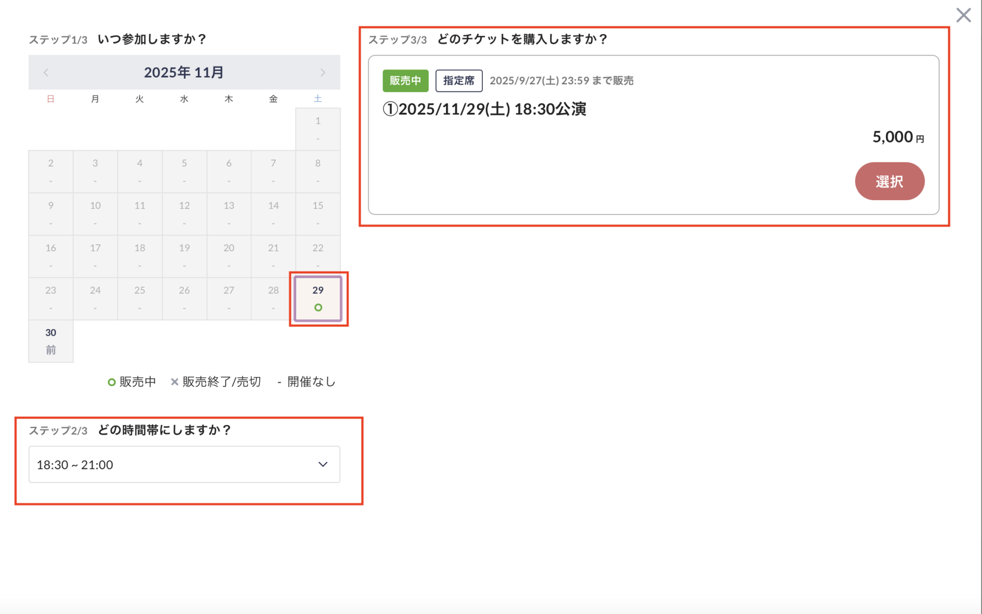 ❶ご希望の公演の日付、❷時間帯、❸チケットを選択