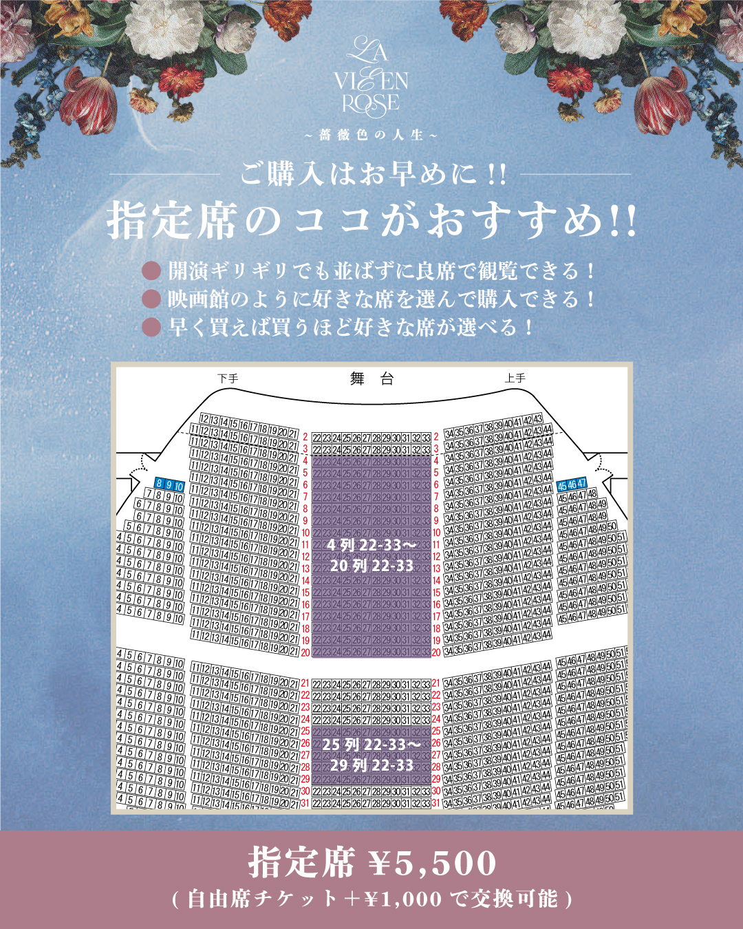 指定席への交換を希望する場合、交換する公演の自由席チケットを必ずご持参ください。