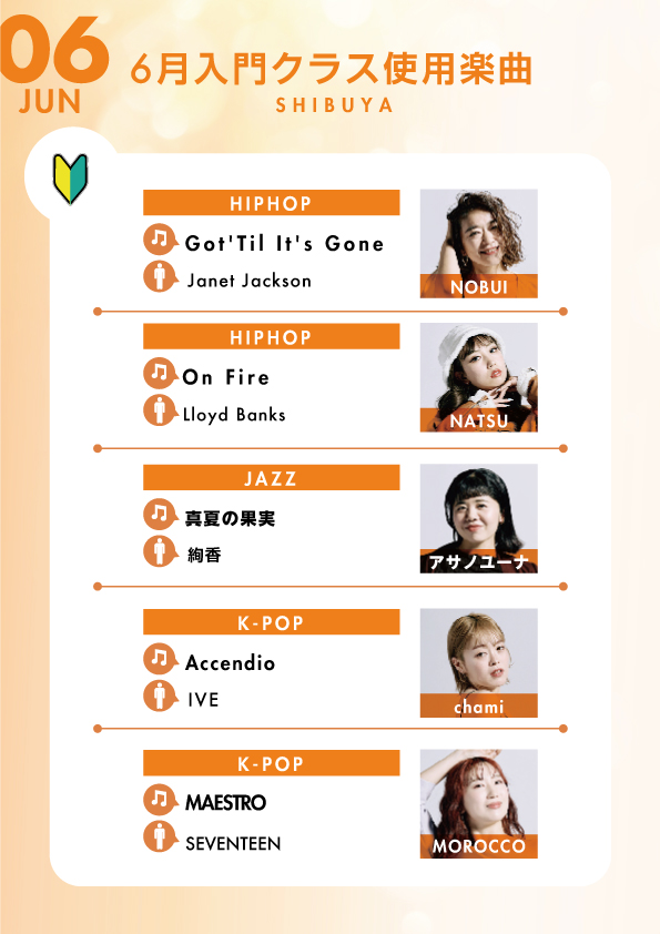 6月の入門使用曲はこちらです! ダンスが初めての方でも大丈夫!入門クラスの先生がゆっくり丁寧に教えてくれますよ😍 体験予約も随時受付中です!夏に向けてダンスを始めてみませんか? 皆様のご来校お待ちしております👌 【HIPHOP】NATSU先生 NOBUI先生 【JAZZ】アサノユーナ先生 【KーPOP】 chami先生 MOROCCO先生