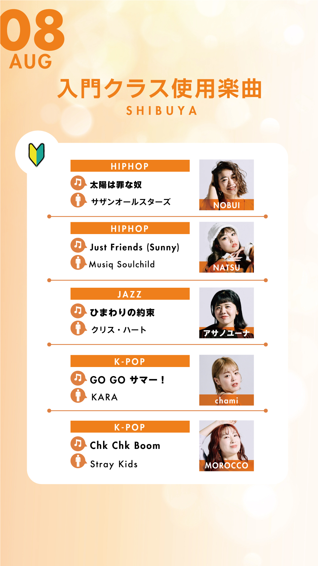 8月の入門使用曲はこちらです! ダンスが初めての方でも大丈夫!入門クラスの先生がゆっくり丁寧に教えてくれますよ😍 体験予約も随時受付中です!夏、ダンスを始めてみませんか? 皆様のご来校お待ちしております👌 【HIPHOP】NATSU先生 NOBUI先生 【JAZZ】アサノユーナ先生 【KーPOP】 chami先生 MOROCCO先生