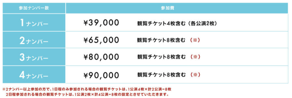 ※参加費用にはリハーサル料、楽屋・舞台使用料、観覧チケット料、イベント制作料、広告デザイン料、人件費などが全て含まれた費用一式となります。