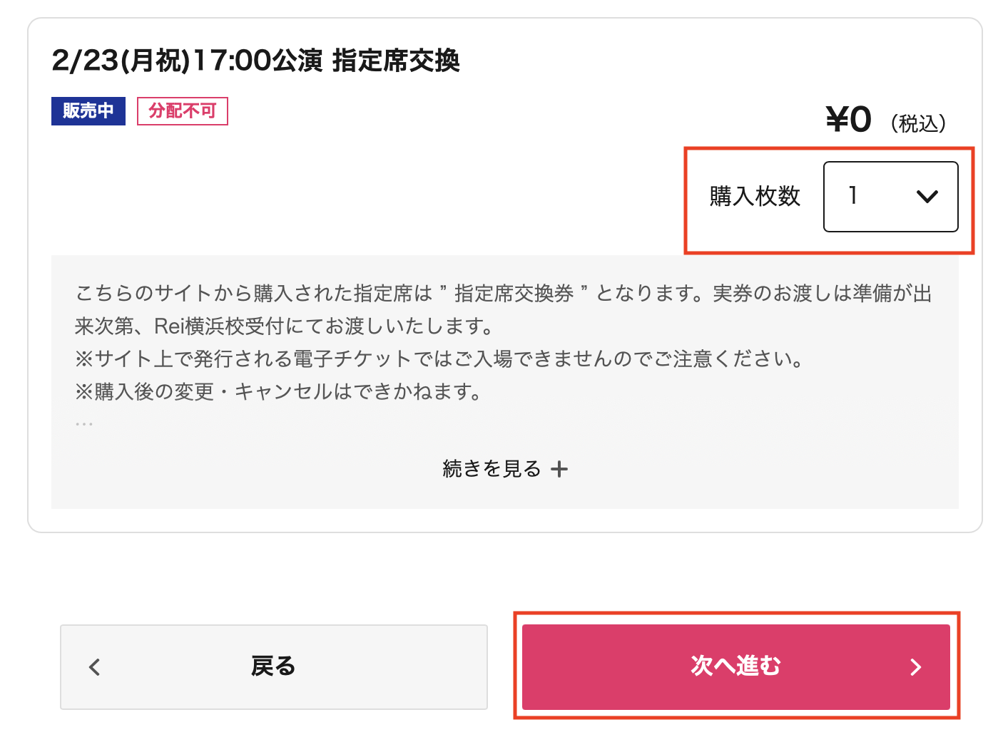 ⑦申込後、後日横浜校受付にて、交換希望公演の自由席チケット+差額 1,000円をお持ちいただき、実券と交換いたします。(※実券の交換は、準備が整い次第Rei横浜校受付にて行います。)