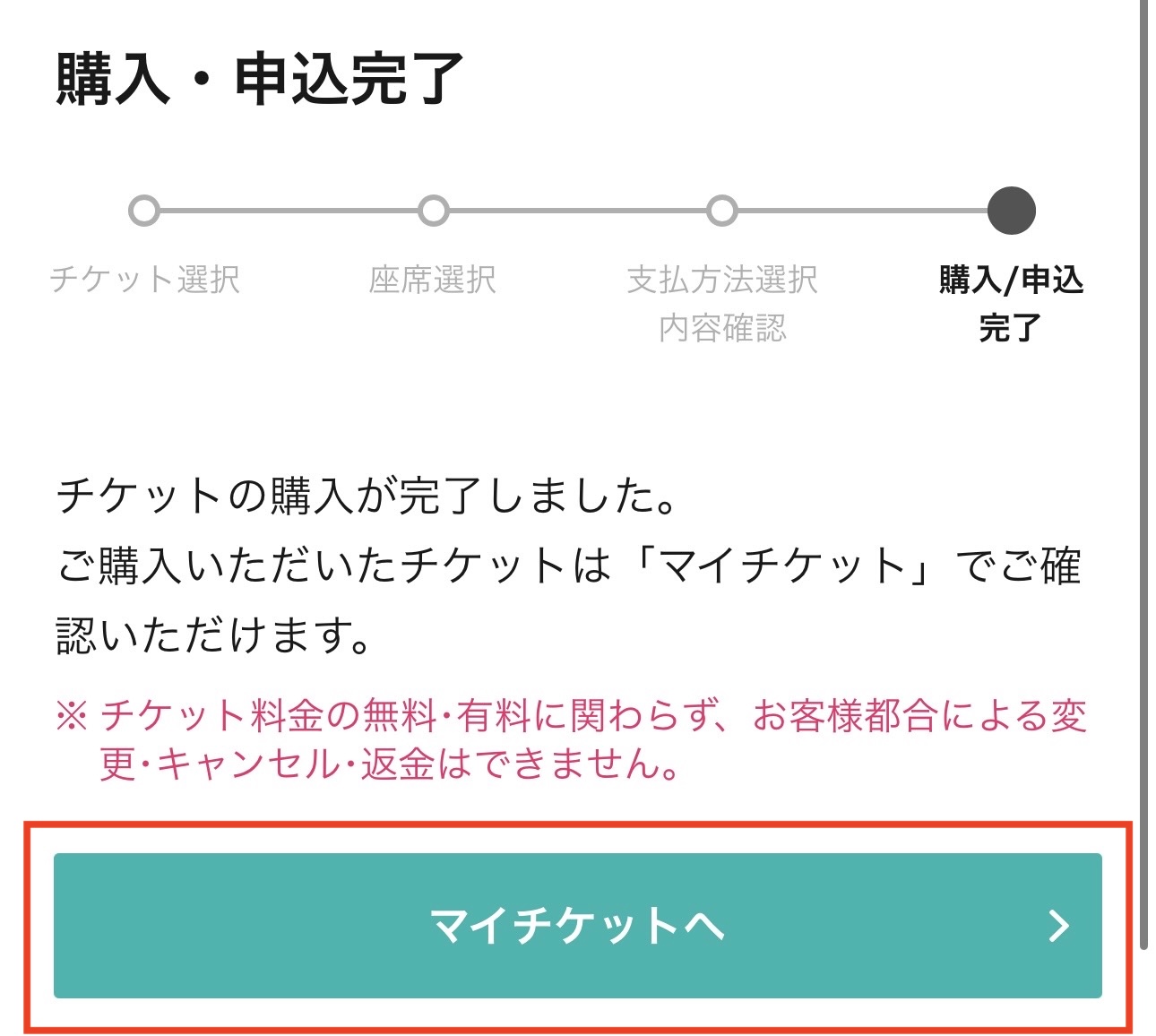 ⑥以下画面が表示されましたらお申込み完了となります。指定した座席を確認したい場合は「マイチケット」からご確認ください。
