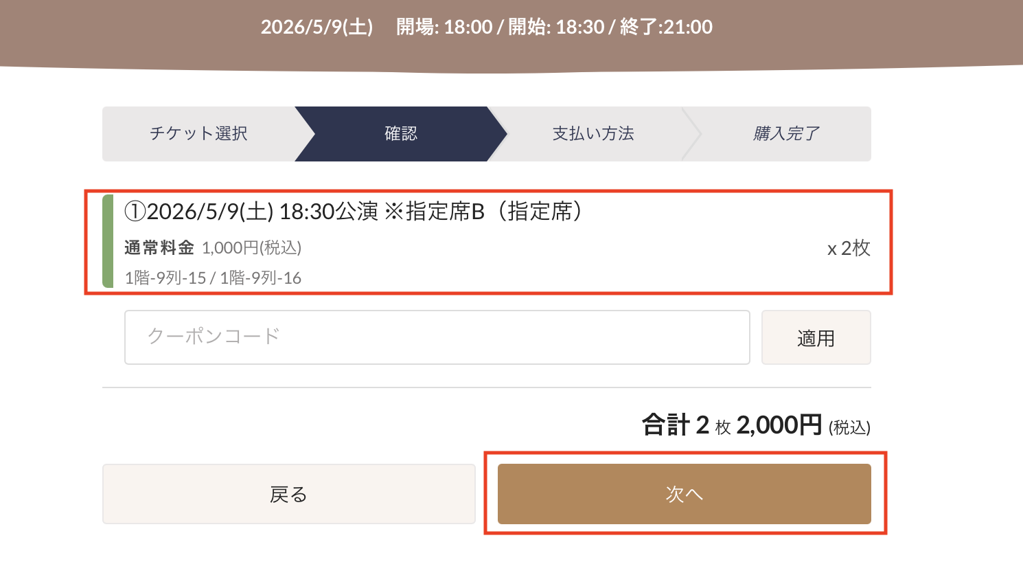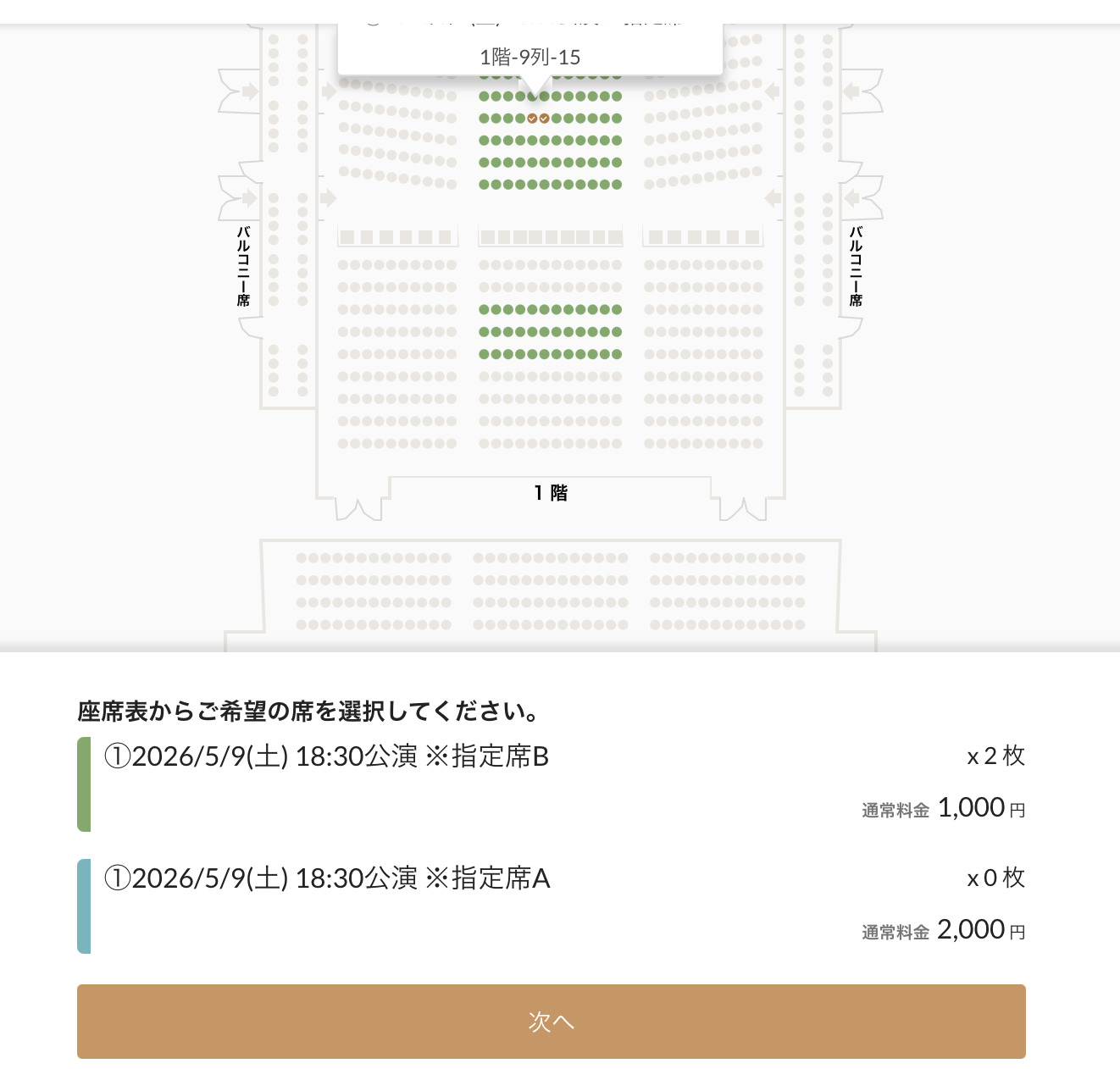 ③座席を選択(購入ページで選択可能)→次へ進む (※1公演ごとのチケット選択となります。)