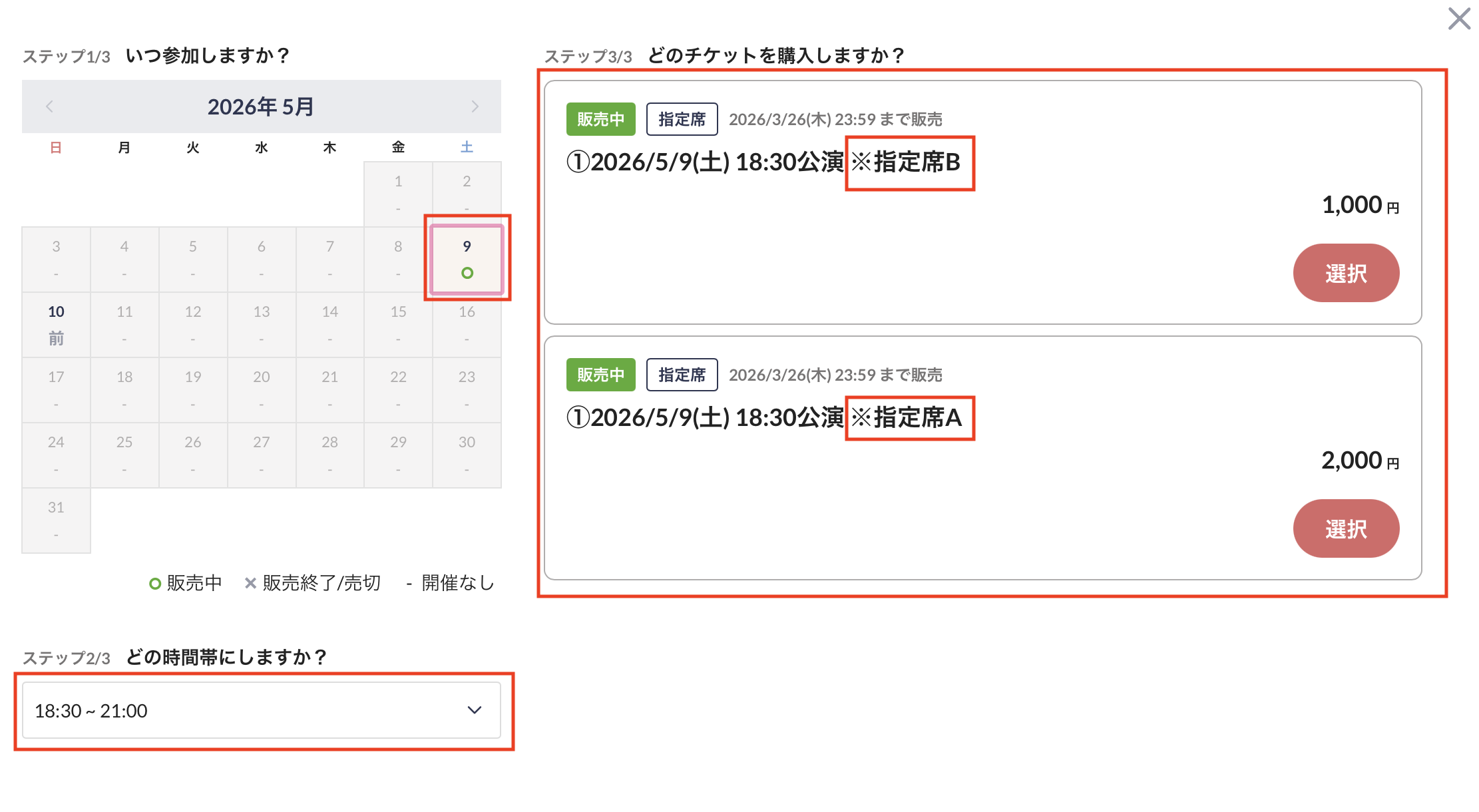 ❶ご希望の公演の日付、❷時間帯、❸チケットを選択