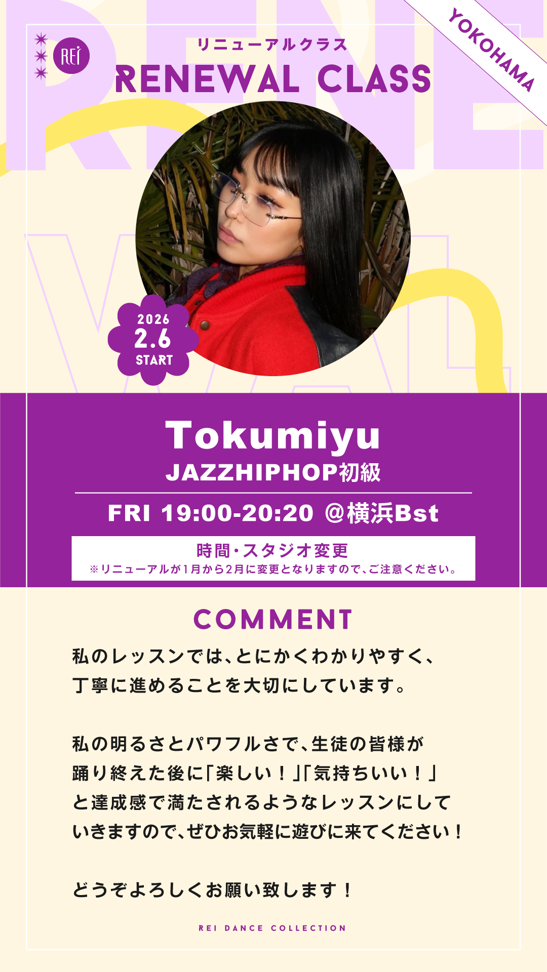 🗓️リニューアルクラス 【2/6(金)スタート】Tokumiyu / JAZZHIPHOP初級 (金)19:00-20:20@横浜Bst リニューアルクラス ✨Tokumiyu先生の詳しいプロフィールはこちらから✨