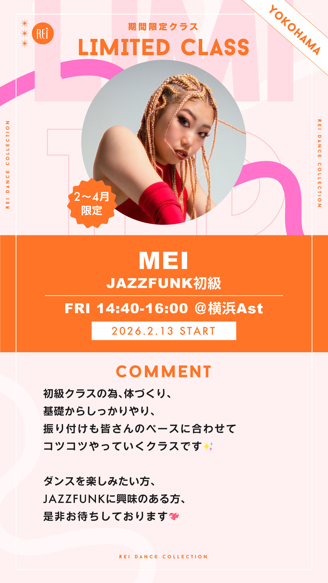 🗓️期間限定クラス 【2〜4月期間限定】MEI / JAZZFUNK初級 (金)14:40-16:00@横浜Ast 🗓️リニューアルクラス 【2/6(金)スタート】Tokumiyu / JAZZHIPHOP初級 (金)19:00-20:20@横浜Bst 期間限定クラス ✨MEI先生の詳しいプロフィールはこちらから✨ リニューアルクラス ✨Tokumiyu先生の詳しいプロフィールはこちらから✨
