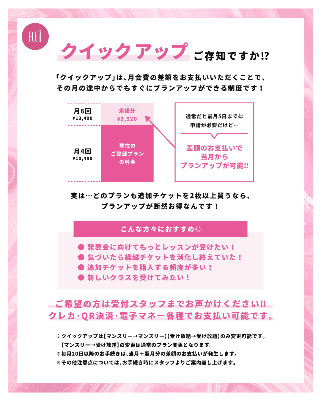 ✅ 月4回コース(¥10,480)から月6回コース(¥13,400)にクイックアップする場合